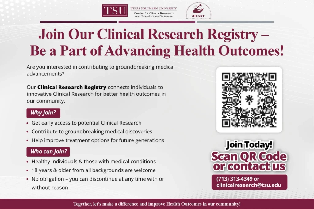 The registry’s goal is to build a comprehensive, diverse database of participants at Texas Southern University’s Center for Clinical Research and Translational Sciences (CCRTS). It helps identify individuals for a wide range of clinical studies, from observational research to interventional trials.